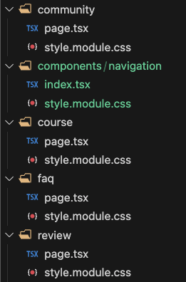 위 네비게이션 바 메뉴의 구성에 맞춰 폴더와 페이지, 스타일 파일을 구성합니다. community, course, faq, review 폴더를 생성하고 page.tsx와 style.module.css 를 각각 만들었습니다.